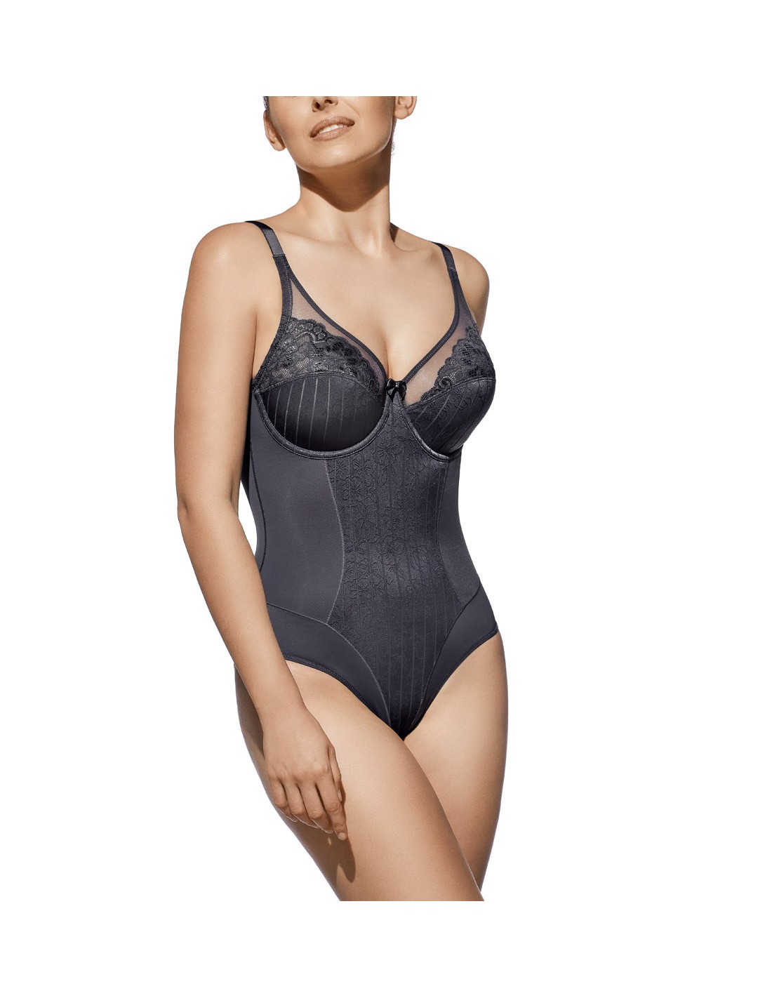 Body con aros que combina un tejido de franjas con la copa bordada en tul con encaje.