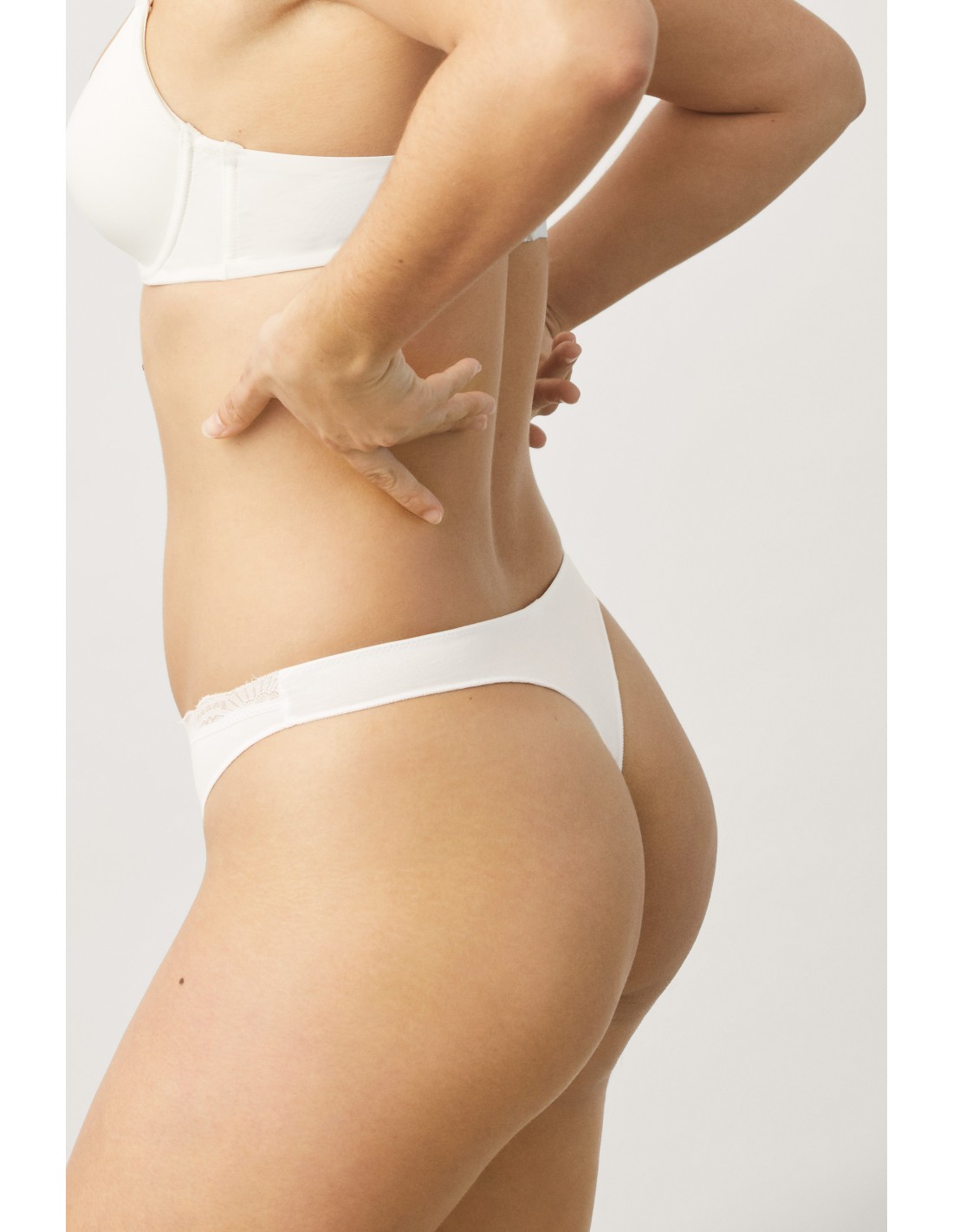 Tanga en tejido Cotton Nature. Las fibras naturales de este material aportan un extra de suavidad a la prenda. Sus acabados con costuras planas invisibles evitan las marcas y favorecen una mayor adaptabilidad y un ajuste ergonómico perfecto. Modelo básico de gran confort pensado para el día a día. Decoradas con blonda. Confeccionadas con material antialergénico.
