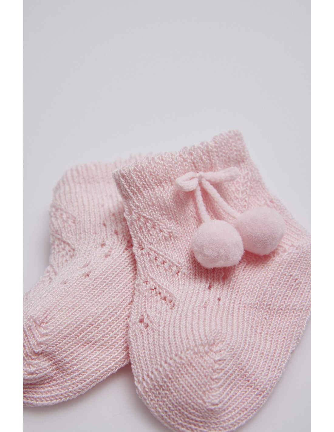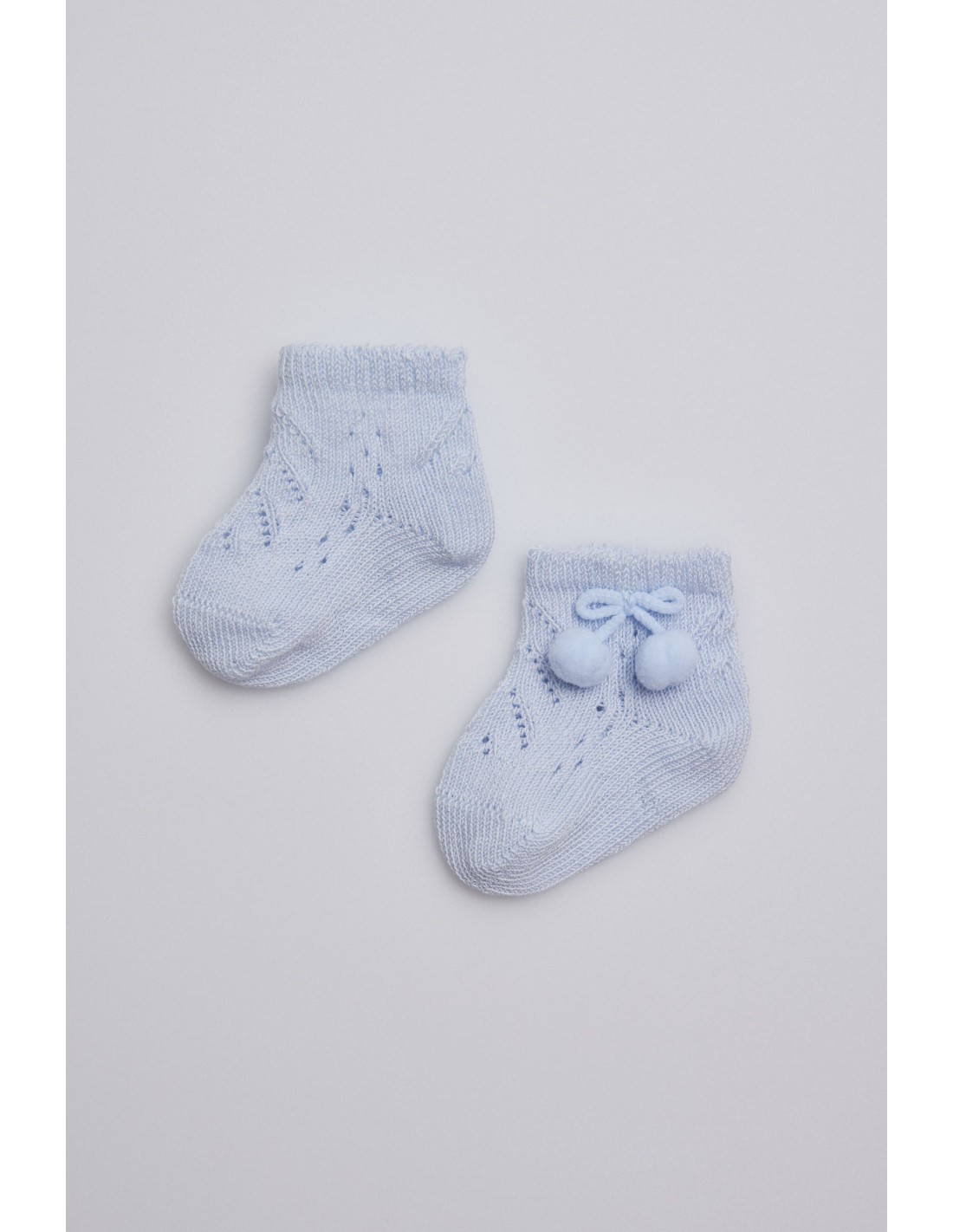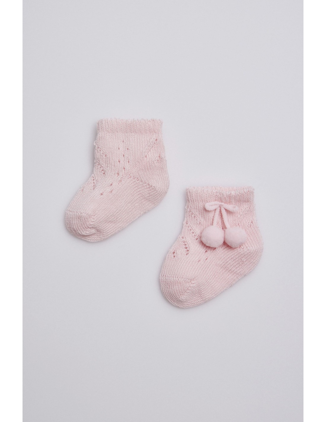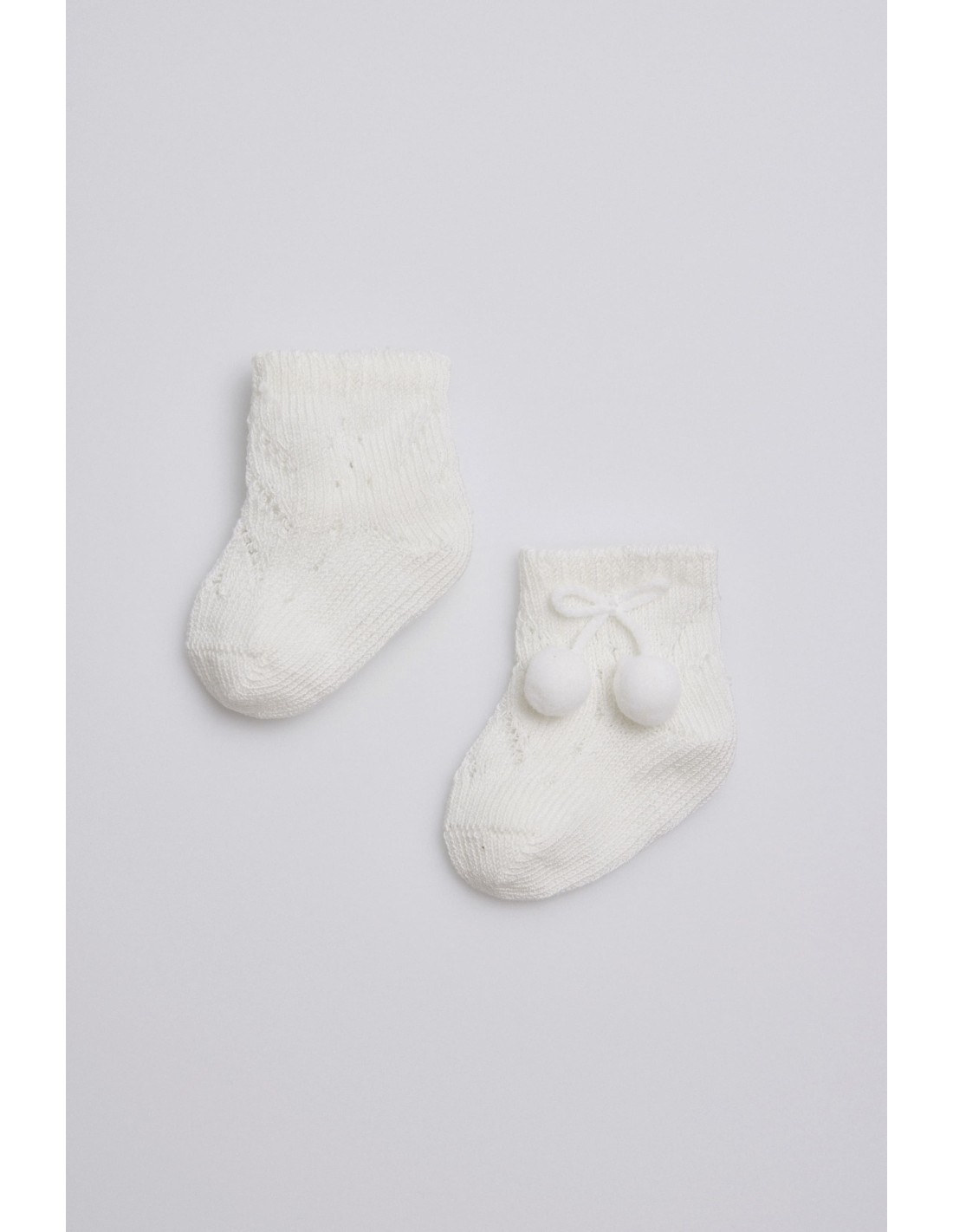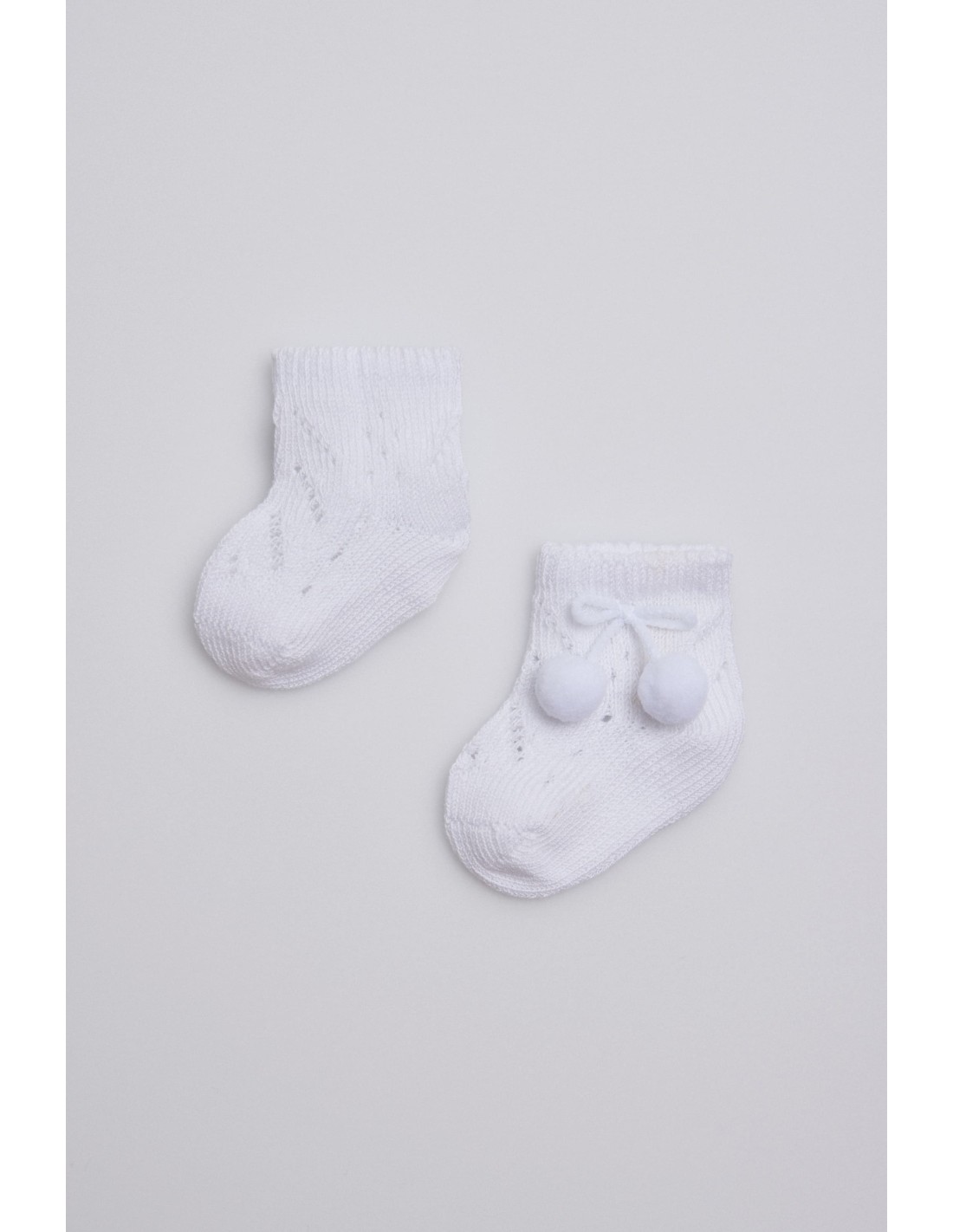 Calcetín básico recién nacido. Tejido en suave calado en algodón y dulces decoraciones en el tobillo, se ajusta ergonómicamente al pie del bebé evitando que deslice. Cuidado prenatal asegurado con el puño especial antipresión. El confort necesario para los más pequeños de la casa.