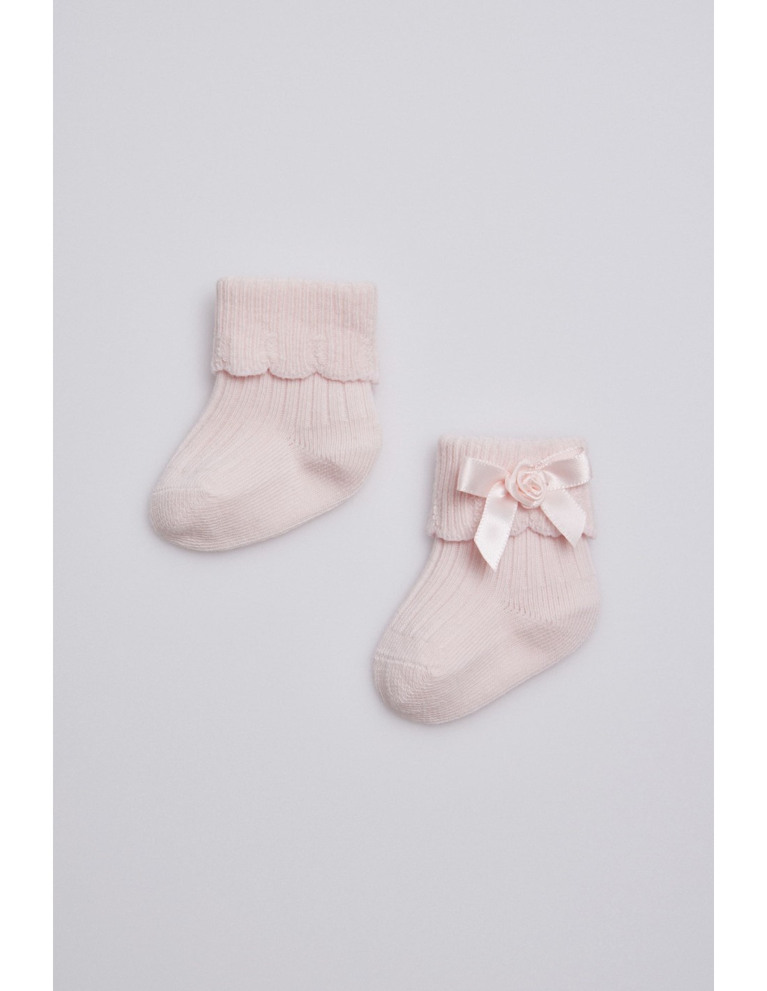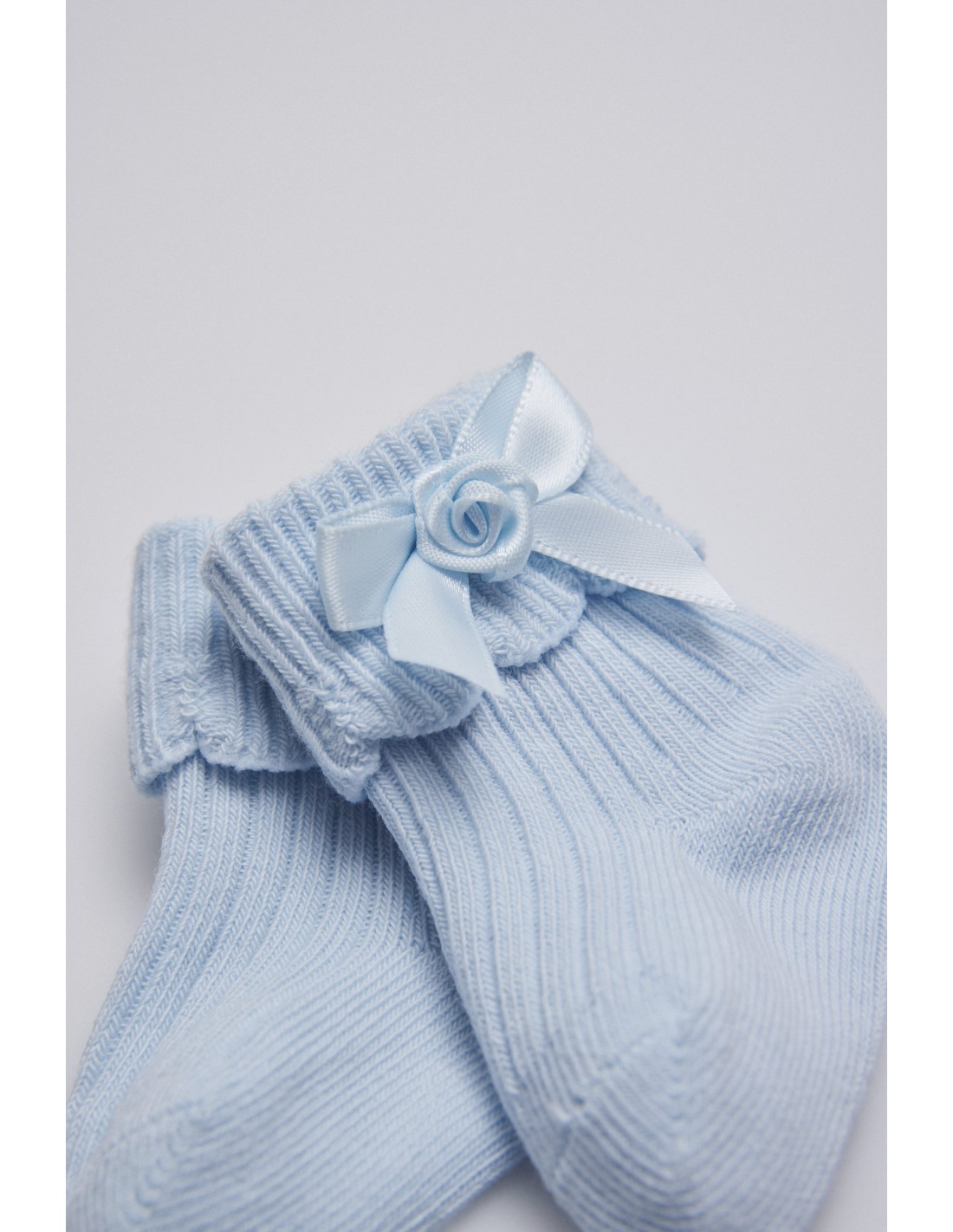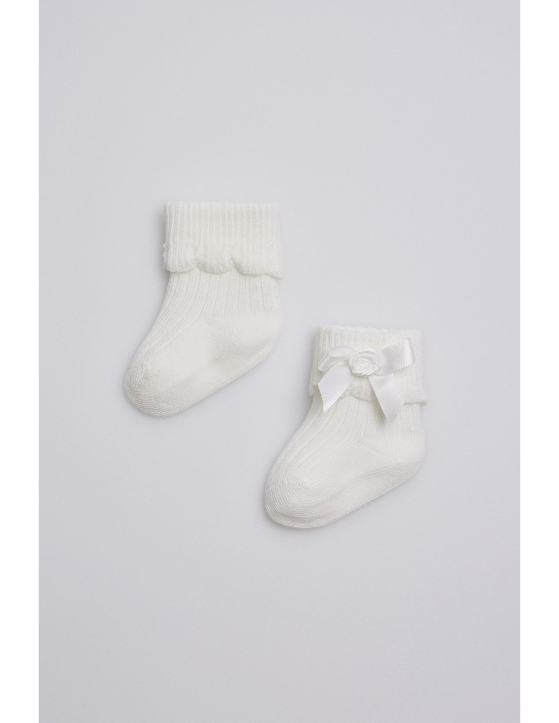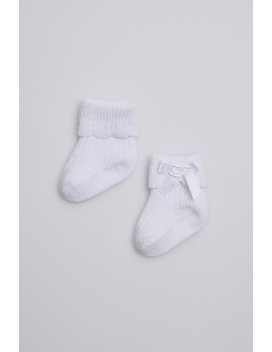 Calcetín básico recién nacido. Tejido en suave algodón canalé, se ajusta ergonómicamente al pie del bebé evitando que deslice. Cuidado prenatal asegurado con el doble puño especial antipresión. Decorados con lazo de raso, estos dulces calcetines son el confort necesario para los más pequeños de la casa.
