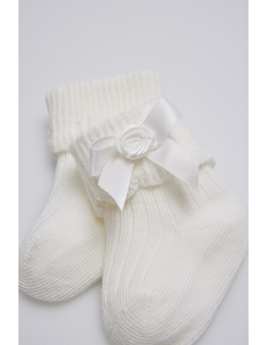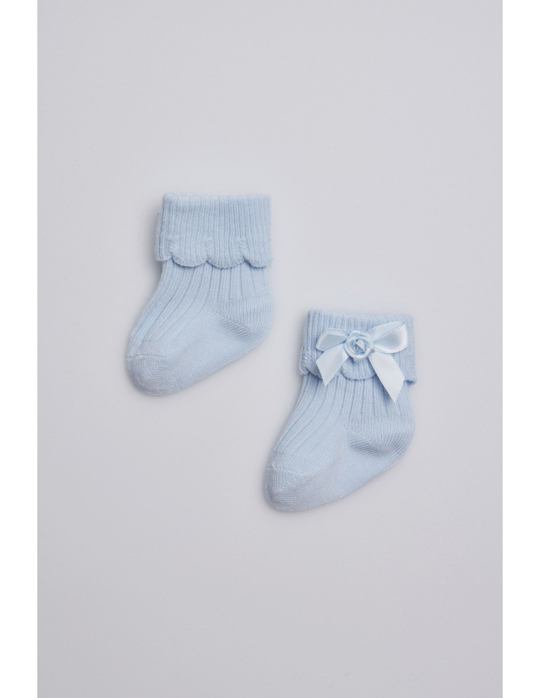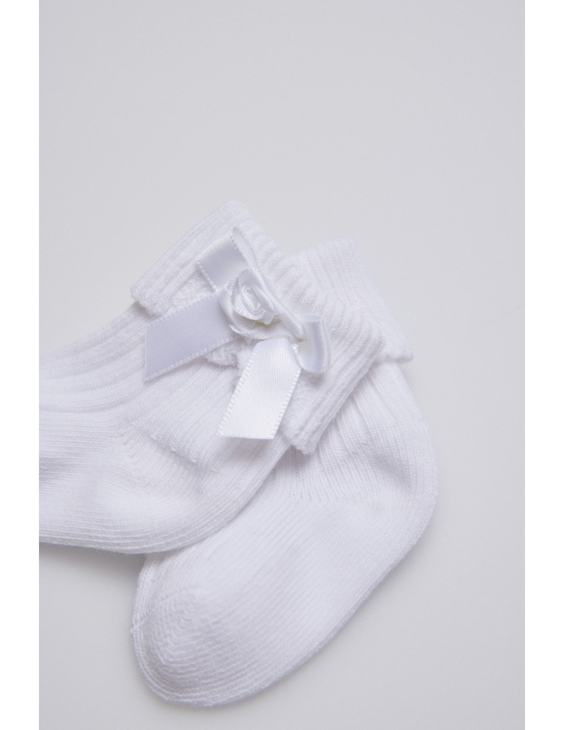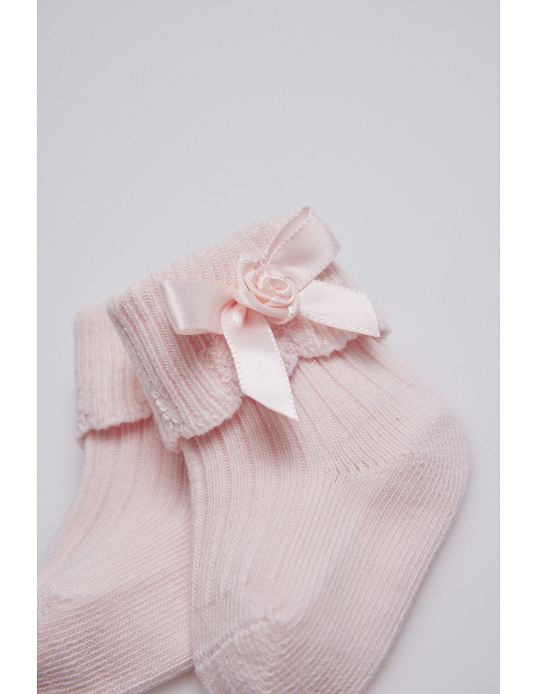 Calcetín básico recién nacido. Tejido en suave algodón canalé, se ajusta ergonómicamente al pie del bebé evitando que deslice. Cuidado prenatal asegurado con el doble puño especial antipresión. Decorados con lazo de raso, estos dulces calcetines son el confort necesario para los más pequeños de la casa.