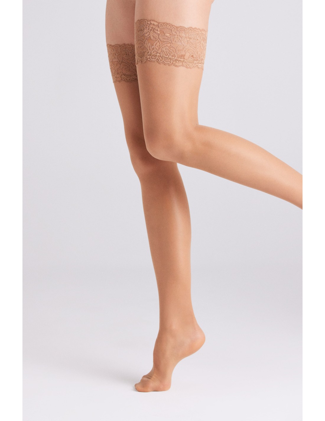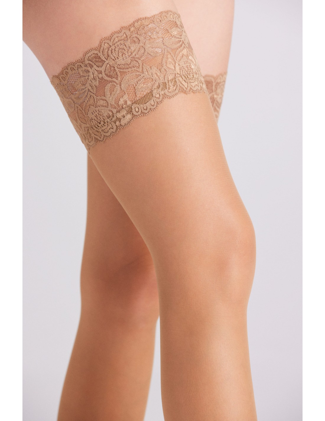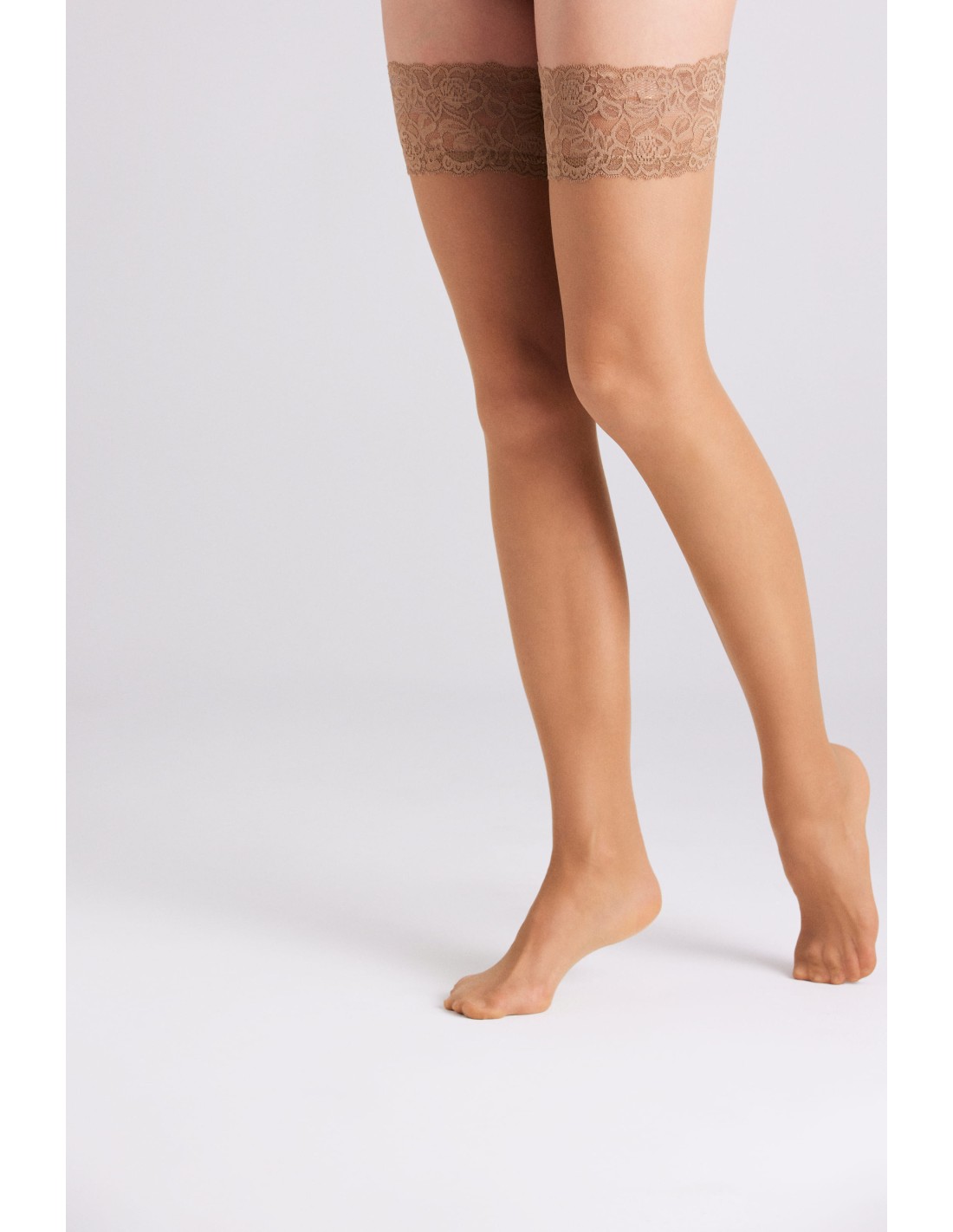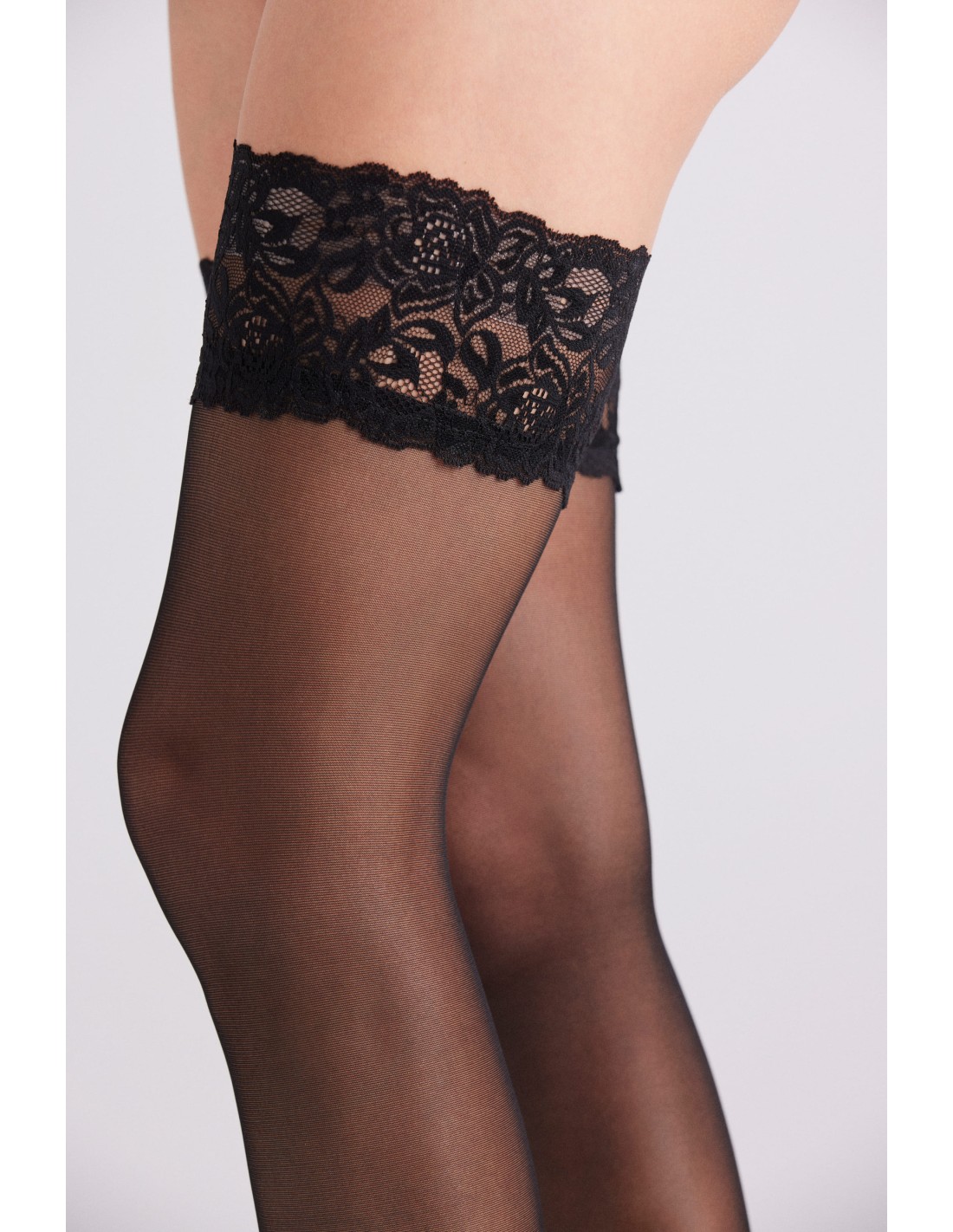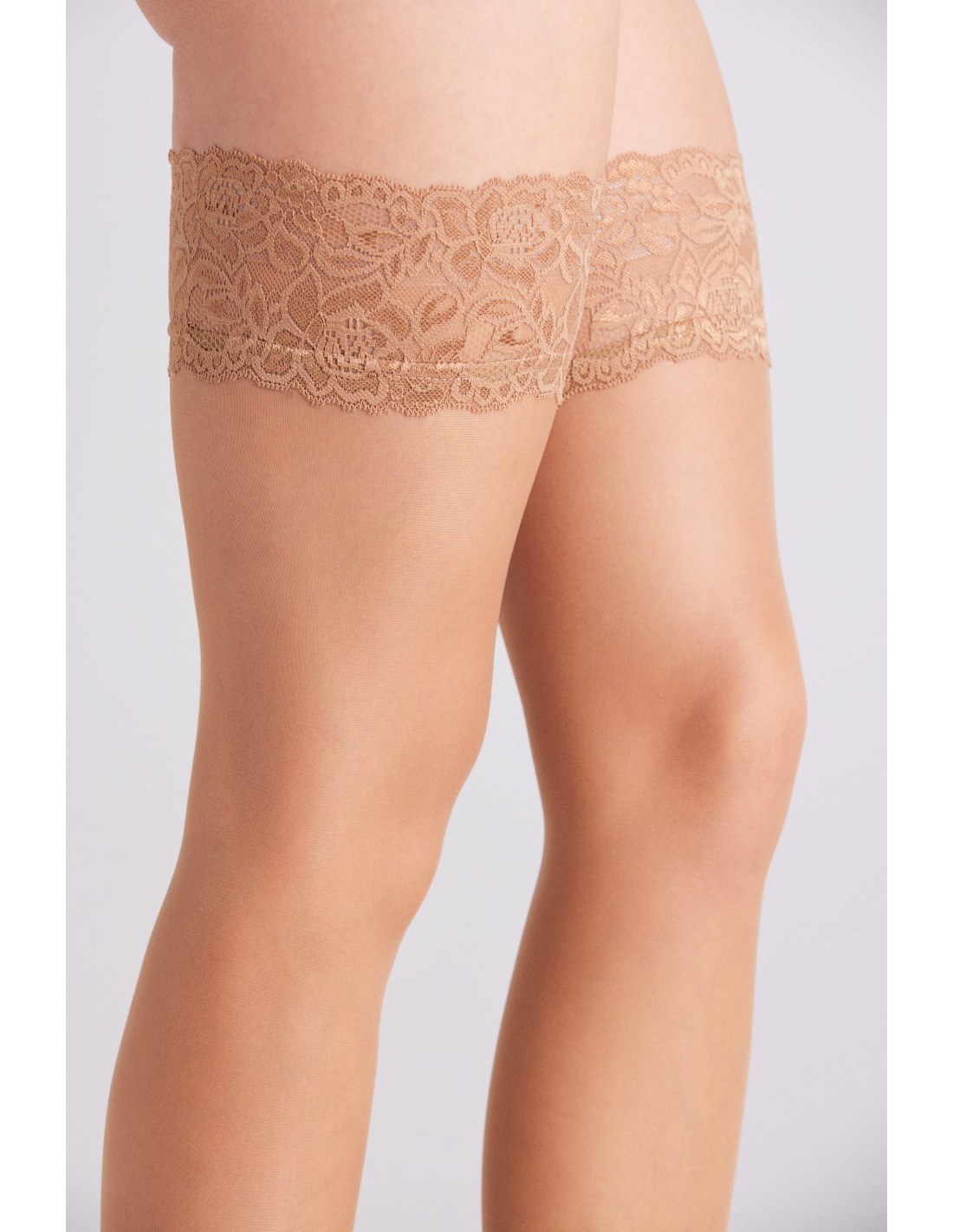 Media de 20 DEN. Con liga de blonda y dos bandas de silicona para una sujeción total.