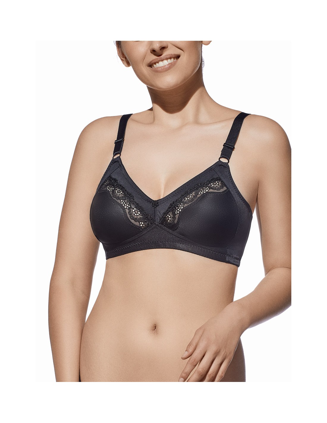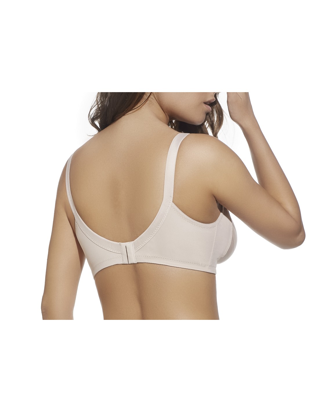 Sujetador clásico sin aros, copa preformada y tira bordada en el escote. Está fabricado en tejido simplex para dar mayor sujección.