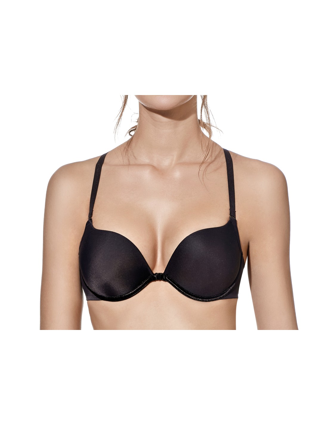 Sujetador con aros y copa de relleno doble 'push up' con apertura delantera. Espalda en Y multiposiciones.