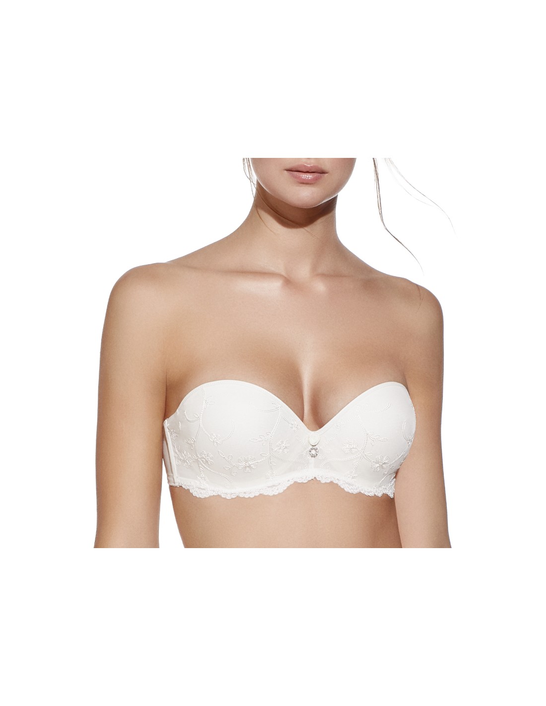 Sujetador para novias sin tirantes, con aros y copa de relleno doble 'push up'. Lleva tul bordado e incluye un juego de tirantes textiles.