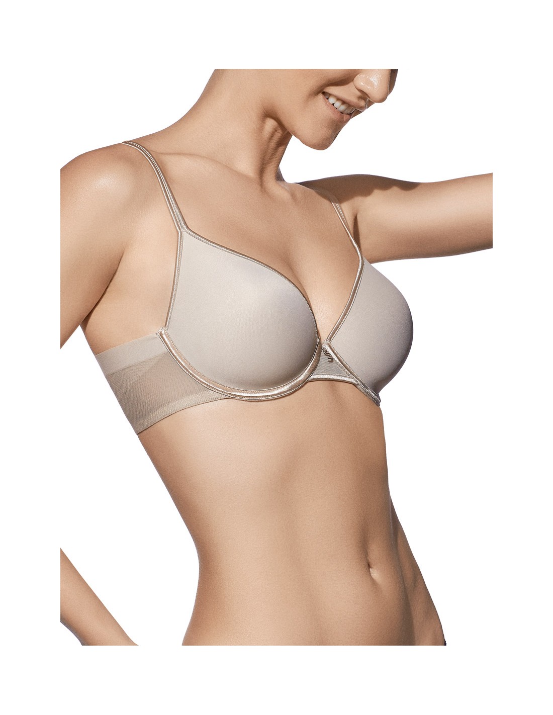 Sujetador con aros y copa de relleno, fabricado en microfibra, elegante y cómodo cruce de tules en la espalda. Ideal para minimizar imperfecciones.